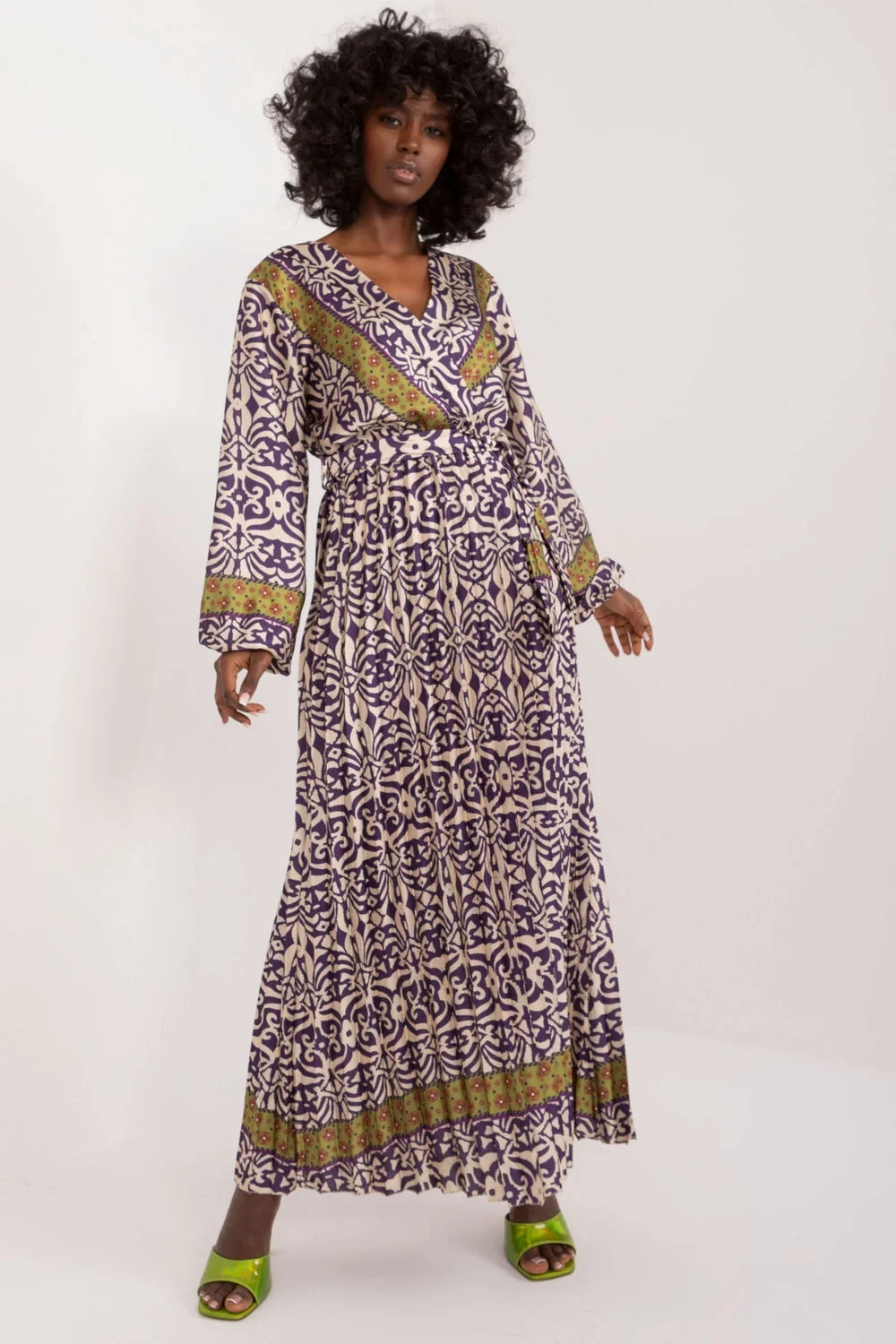 Tyto maxi šaty s barevným potiskem jsou ideální volbou pro různé příležitosti, neformální i společenské. Jsou vyrobeny převážně z polyesteru, jsou odolné a pohodlné na nošení. Šaty mají obálkový výstřih, který jim dodává eleganci a ženskost. Rozšířený střih poskytuje volnost pohybu a stylový vzhled, zatímco bufetový dlouhý rukáv dodává nádech sofistikovanosti. Šaty mají zavazovací pásek, který zvýrazňuje pas a dodává siluetě krásný tvar. Díky barevnému potisku jsou šaty jedinečné a poutavé, ideální pro různé příležitosti.