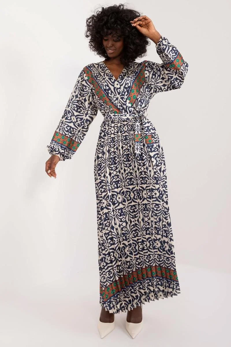 Tyto maxi šaty s barevným potiskem jsou ideální volbou pro různé příležitosti, neformální i společenské. Jsou vyrobeny převážně z polyesteru, jsou odolné a pohodlné na nošení. Šaty mají obálkový výstřih, který jim dodává eleganci a ženskost. Rozšířený střih poskytuje volnost pohybu a stylový vzhled, zatímco bufetový dlouhý rukáv dodává nádech sofistikovanosti. Šaty mají zavazovací pásek, který zvýrazňuje pas a dodává siluetě krásný tvar. Díky barevnému potisku jsou šaty jedinečné a poutavé, ideální pro různé příležitosti.