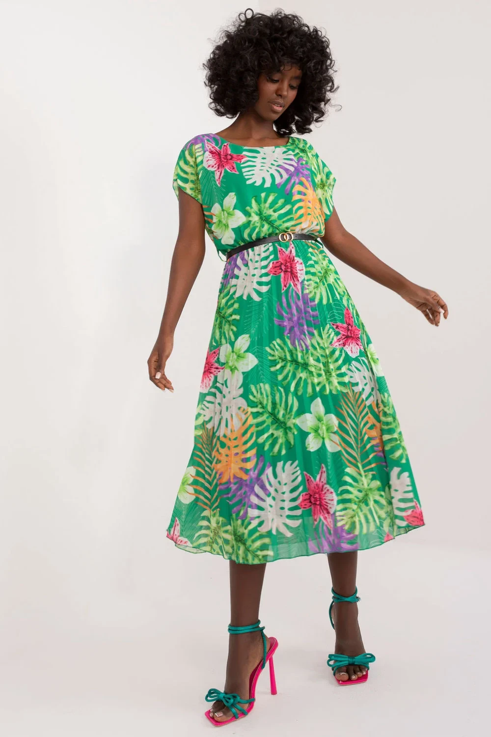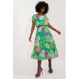 Letní šaty s krátkými rukávy, kulatým výstřihem a rozšířeným lemem. Šaty z barevné vzorované látky s podšívkou. Ideální pro mnoho příležitostí.