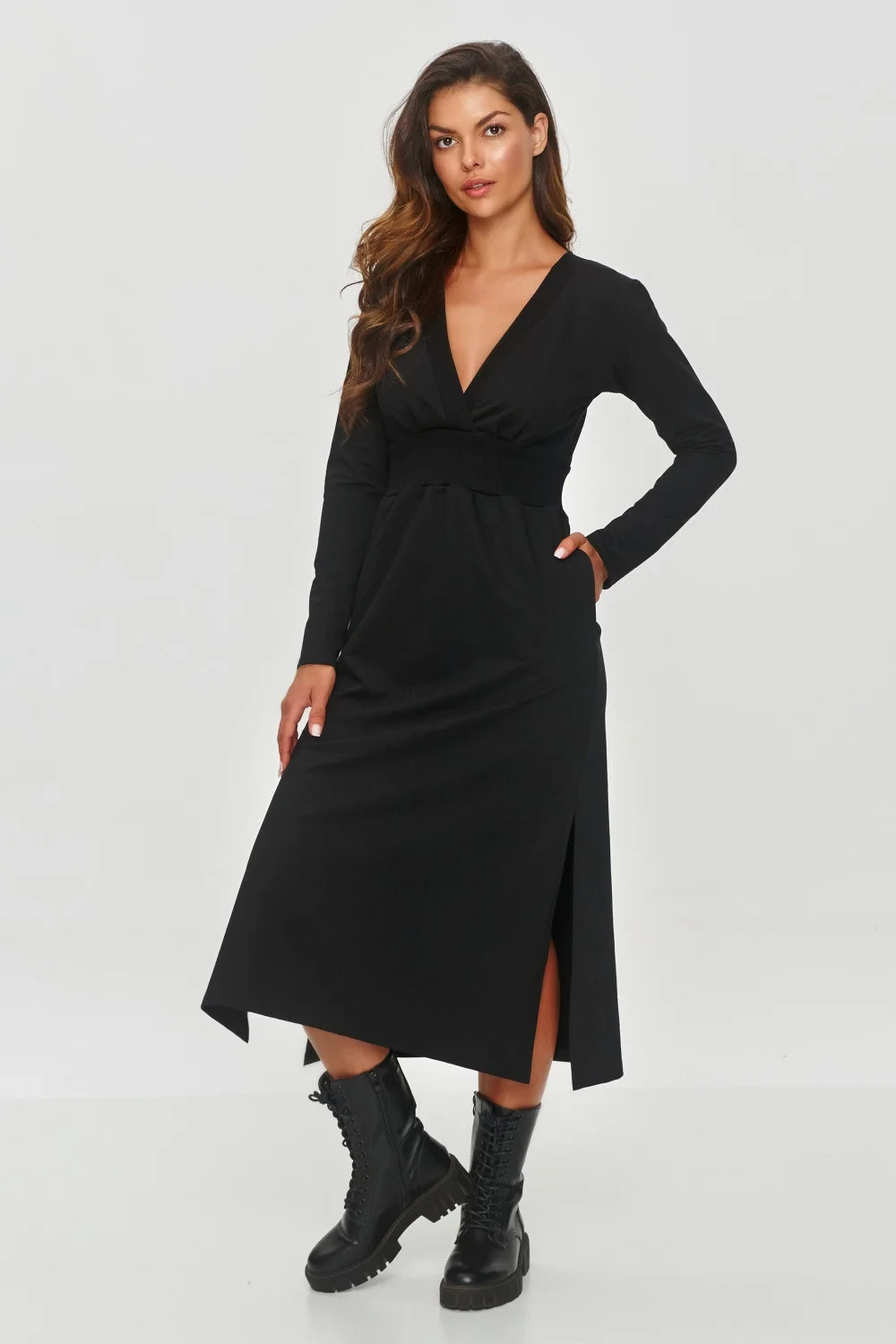 Dresové šaty jsou návrhem klasického, ale moderního střihu. Model má midi délku sahající pod kolena, s přizpůsobeným vrchem a jemně rozšířenou sukní. Je vyroben z elastického materiálu, který se dobře přizpůsobuje postavě a zajišťuje pohodlí při nošení. Překrývací výstřih navíc dodává šatům eleganci a zdůrazňuje linii prsou. Pod prsy je elastický široký pás vyrobený z gumy, který opticky zúží pas a dodá postavě proporce. Model má dlouhé rukávy, což ho činí ideálním na chladnější dny. Na bocích šatů jsou kapsy, což jim dodává praktičnost a uvolněný charakter a rozříznutí, které zdůrazňují ženskost a usnadňují pohyb. Šaty lze nosit s černými worker botami, což dodává stylizaci trochu drsnější charakter, ideální na podzimní dny nebo sportovní obuv, kde získá na uvolněnějším, sportovním vzhledu. Tyto šaty jsou ideální návrhem na každý den, ale také na formální příležitosti díky kombinaci elegance s funkcionalitou detailů.