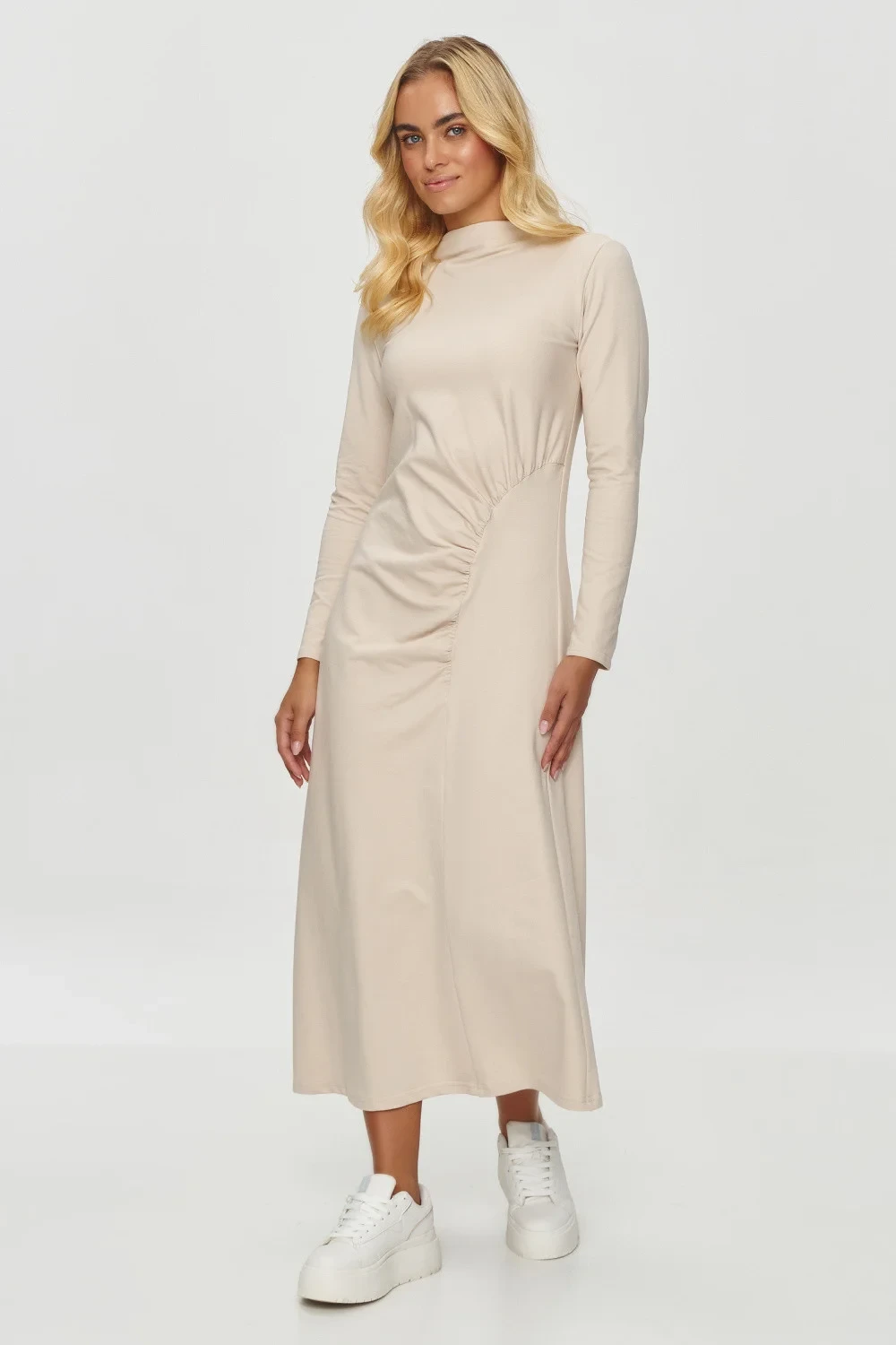 Drapované šaty vytvářejí elegantní a minimalistický návrh, který kombinuje jednoduchost s jemnými detaily. Model má midi délku sahající do poloviny lýtek, co jí dodává eleganci a klasický vzhled. Střih je jednoduchý, ale s efektním akcentem v podobě řasení na levé straně pasu, co dodává šatičce tvar a zdůrazňuje siluetu. Model má dlouhé rukávy, které zajišťují pohodlí a dělají model vhodným na chladnější dny. Vysoký límec dodává šatičce eleganci a zároveň ji udržuje v casual stylu. Řasení v oblasti pasu je jemným detail, který jí dodává dynamiku a lehkost, subtilně zdůrazňující ženské tvary. Díky neutrálním barvám mohou být šaty snadno kombinovány s různými doplňky, jak v elegantním, tak v více casual stylu. Model je ideální pro ženy, které ocení pohodlí, jednoduchost, ale zároveň neodmítají ženský styl. Můžete je kombinovat se sportovním obuví, získávají outfit s moderním a sportovním charakterem. Taková stylizace se hodí na každý den, na setkání s přáteli nebo na procházku.
