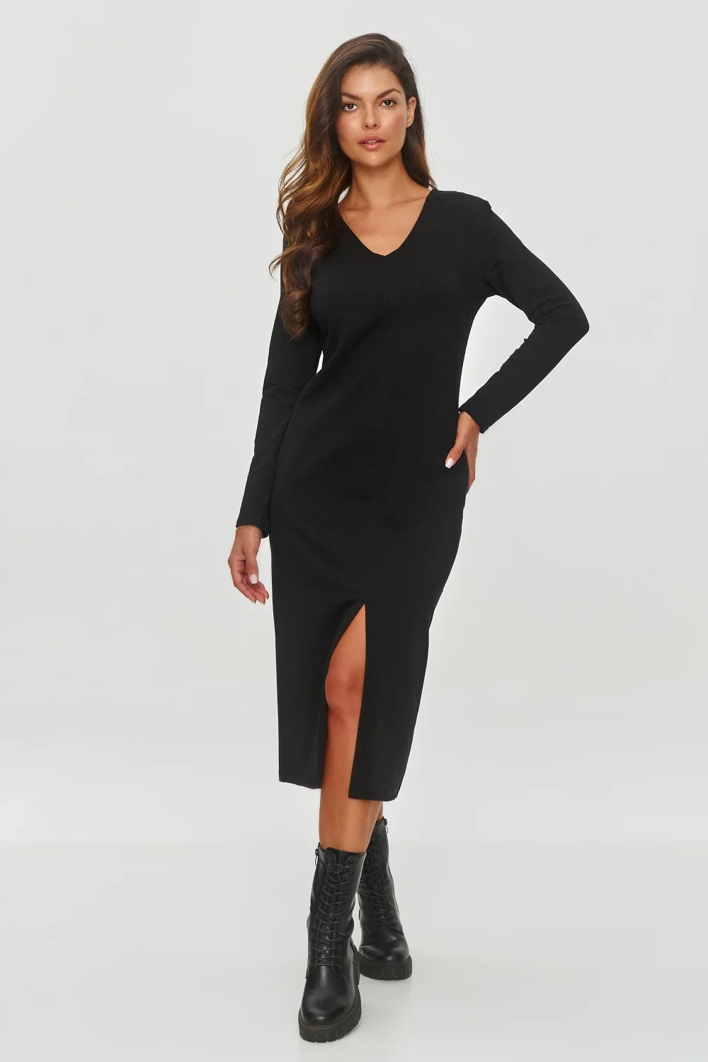Dresové šaty jsou elegantní, ale zároveň jednoduchá nabídka na každý den, která kombinuje minimalismus s trochou stylu. Model má jednoduchý, přiléhající střih, který zdůrazňuje siluetu, ale zároveň zůstává pohodlný. Délka šatů sahá do poloviny lýtek, což jim dodává klasický charakter. Měkký a elastický materiál zajišťuje pohodlí nošení po celý den. Šaty mají dlouhé rukávy, ideální pro chladnější dny. Výstřih má tvar písmene V, který opticky prodlužuje krk a dodává eleganci. Na přední straně šatů se nachází subtilní rozštěp u spodu, který jim dodává lehkost a umožňuje volnost pohybu. Můžete je kombinovat s bílými teniskami, což dodá celkovému vzhledu sportovní, ale stále elegantní vzhled, nebo nosit s botkami nebo balerínami, aby se dosáhlo formálnějšího efektu. Tyto šaty jsou ideální volbou na každodenní vycházky, setkání s přáteli nebo do práce. Díky svému jednoduchému střihu a elegantním detailům se snadno stylizují na různé příležitosti.