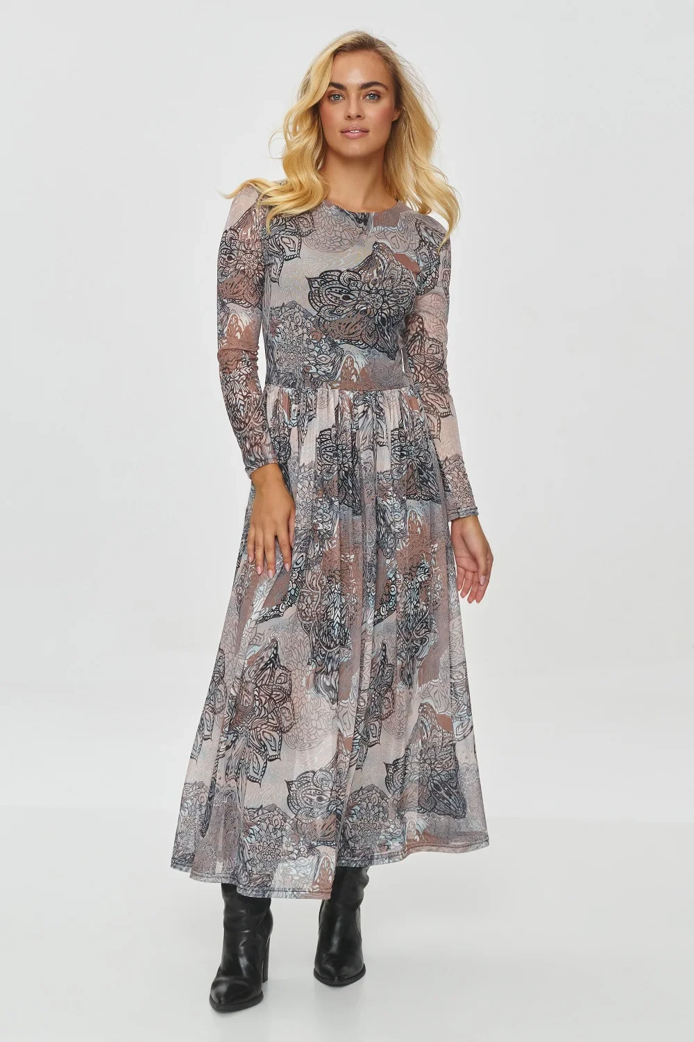 Dlouhé potiskové šaty vyrobené z lehkého, prosvětleného materiálu, který jim dodává elegantní a romantický vzhled. Vzor šatů je složitá směs rostlinných, zvířecích a abstraktních motivů v dominujících barvách černé, bílé, béžové, hnědé a odstínech oranžové. Vzor je složitý a zároveň originální, dodávající kreaci výrazný styl. Model má lehce přizpůsobený vrch, který zdůrazňuje pas, zatímco spodek je rozšířený, což mu dodává lehkosti a pohybu. Dokončení šatů je jemné a materiál je poloprůhledný, což zdůrazňuje jejich jemnost. Šaty mají viskózovou podšívkou, která diskretně zakrývá strategická místa a zajišťuje pohodlí při nošení. Spojení s těžkými kotníkovými botami vytváří kontrast s jemností šatů, dodávající celku trochu více neformální vzhled. Šaty jsou ideální na podzimní nebo zimní večery díky svým teplým barvám a dlouhým rukávům. Kreace je k dispozici v pěti variantách, lišících se barvou a vzorem.