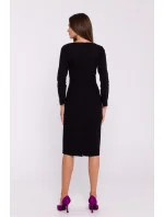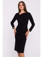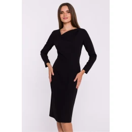 Elegantní tkané šaty jednoduchého tužkového střihu, které se hodí pro různé příležitosti. Dlouhé rukávy a vykrojení v pase jemně zvýrazňují siluetu a vytvářejí klasický vzhled. Šaty se vyznačují asymetrickým výstřihem s překrytím, který dodává originalitu a moderní styl. Délka pod kolena a rozparek na zádech ve spodní části zajišťují volnost pohybu a eleganci. Na zádech je krytý zip pro diskrétní zapínání. Šaty jsou bez podšívky, takže jsou lehké a pohodlné. Jsou navrženy a ušity v Polsku a jsou návrhem pro ženy, které ocení eleganci a jednoduchost.