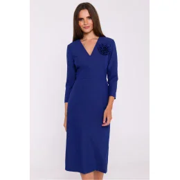 Elegantní látkové šaty jednoduchého tužkového střihu, v pase vykrojené, což decentně zvýrazňuje siluetu. Výstřih do V dodává šatům elegantní nádech a opticky zeštíhluje dekolt. Midi délka zajišťuje klasický vzhled, ideální pro formální i neformální příležitosti. Šaty mají krytý zip na boku a podšívku pro pohodlí a dokonalé přizpůsobení. Dalším ozdobným prvkem je připevněná květina na hrudi, která dodává na originalitě. Šaty byly navrženy a ušity v Polsku a jsou ideální volbou pro ženy, které ocení styl a eleganci.