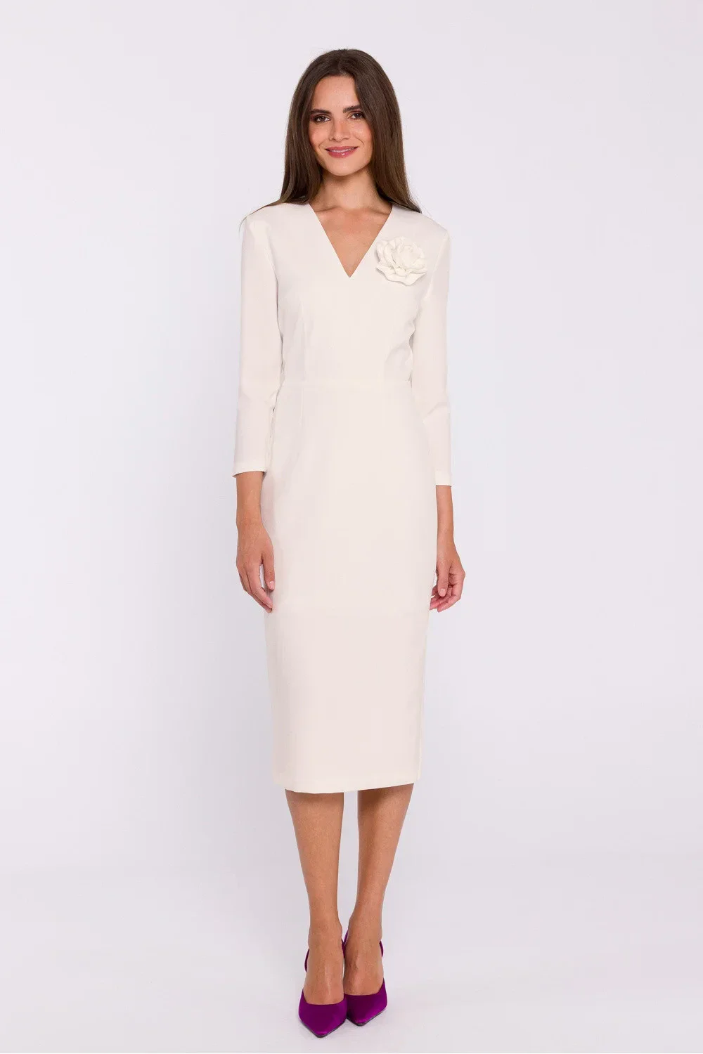 Elegantní látkové šaty jednoduchého tužkového střihu, v pase vykrojené, což decentně zvýrazňuje siluetu. Výstřih do V dodává šatům elegantní nádech a opticky zeštíhluje dekolt. Midi délka zajišťuje klasický vzhled, ideální pro formální i neformální příležitosti. Šaty mají krytý zip na boku a podšívku pro pohodlí a dokonalé přizpůsobení. Dalším ozdobným prvkem je připevněná květina na hrudi, která dodává na originalitě. Šaty byly navrženy a ušity v Polsku a jsou ideální volbou pro ženy, které ocení styl a eleganci.