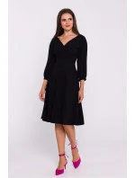 Romantické šaty z měkkého úpletu kombinují ženský styl s výjimečným pohodlím při nošení. Horní část obálkového střihu je krásně zvýrazněna výstřihem do V s možností spadnutí na ramena pro smyslný a decentní vzhled. Ramena jsou pošita elastickými vsadkami pro pohodlí a stabilitu. Nafouklé rukávy zakončené nastavitelnými vázačkami umožňují upravit délku podle vlastních preferencí. Šaty nemají žádnou podšívku, takže jsou lehké a vzdušné, a krytý zip na zádech zajišťuje estetický střih. Díky délce pod kolena jsou ideální pro různé příležitosti. Šaty byly navrženy a ušity v Polsku a zaujmou kvalitou zpracování a smyslem pro detail.