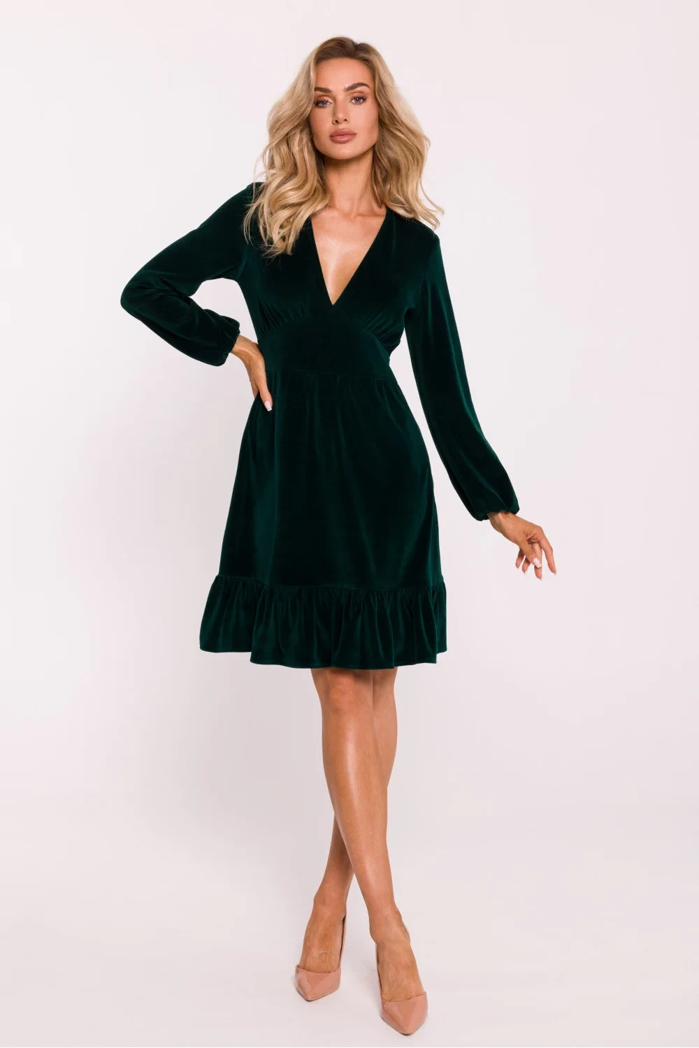 Stylové šaty z měkkého velurového úpletu, které kombinují eleganci s pohodlím. Model se zvýrazněným pasem, který krásně odhaluje ženskou siluetu, a hlubokým výstřihem ve tvaru V, který celku dodává smyslnost. Dlouhé bufetové rukávy zakončené gumou dodávají šatům romantický a lehký charakter. Spodní část šatů je mírně rozšířená a zakončená volánkem, který vnáší do šatů jemný pohyb a eleganci, a délka pod kolena je předurčuje k mnoha příležitostem. Skrytý zip na boku zajišťuje pohodlné zapínání a díky absenci podšívky jsou šaty lehké a pohodlné na nošení. Tyto šaty, navržené a ušité v Polsku, jsou ideální volbou pro ženy, které chtějí spojit módní vzhled s pohodlím pro každodenní nošení i výjimečné události.