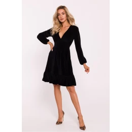 Stylové šaty z měkkého velurového úpletu, které kombinují eleganci s pohodlím. Model se zvýrazněným pasem, který krásně odhaluje ženskou siluetu, a hlubokým výstřihem ve tvaru V, který celku dodává smyslnost. Dlouhé bufetové rukávy zakončené gumou dodávají šatům romantický a lehký charakter. Spodní část šatů je mírně rozšířená a zakončená volánkem, který vnáší do šatů jemný pohyb a eleganci, a délka pod kolena je předurčuje k mnoha příležitostem. Skrytý zip na boku zajišťuje pohodlné zapínání a díky absenci podšívky jsou šaty lehké a pohodlné na nošení. Tyto šaty, navržené a ušité v Polsku, jsou ideální volbou pro ženy, které chtějí spojit módní vzhled s pohodlím pro každodenní nošení i výjimečné události.