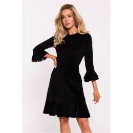 Krásné šaty z velurového úpletu, které kombinují pohodlí s elegantním stylem. Střih v pase dokonale zvýrazňuje siluetu a výstřih dodává klasický nádech. Dlouhé rukávy v délce 7/8 zakončené volánkem dodávají jemný půvab a dívčí šarm. Spodní část šatů, rovněž zakončená volánem, přináší lehkost a pohyb a délka ke kolenům je ideální pro různé příležitosti. Skrytý zip na zádech zajišťuje pohodlné zapínání a díky absenci podšívky jsou šaty lehké a pohodlné na nošení. Šaty byly navrženy a ušity v Polsku a jsou ideální volbou pro ženy, které ocení kombinaci módního vzhledu a každodenního pohodlí.