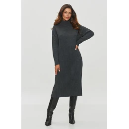 Pletené šaty s jednoduchým, elegantním střihem jsou stylovým a velmi univerzálním kouskem ideálním pro ženy, které ocení nadčasový styl. Model má délku pod kolena a spodní část šatů je vyrobena z žebrovaného úpletu, který zdůrazňuje jejich zajímavou strukturu. Horní část šatů má hladký vzor a límec je zakončen rolákem, který jim dodává hřejivý a útulný charakter, ideální pro chladnější dny. Šaty mají dlouhé, mírně vypasované rukávy, což podtrhuje jejich minimalistický a elegantní styl. Jsou ideální jak pro běžné nošení, tak pro formálnější příležitosti.
