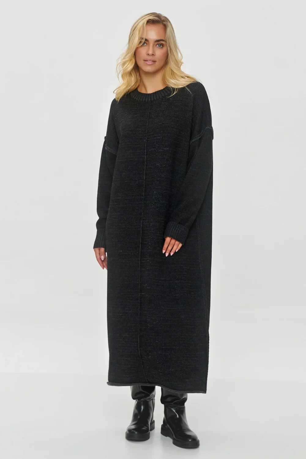 Dámský dlouhý svetr volného střihu z látky s melanžovým vzorem. Svetr má oversized střih s dlouhými rukávy, což mu dodává na pohodlí a ležérním stylu, a snížená linie ramen dokonale zakrývá objemnější ramena. Je zakončen širokými žebrovanými manžetami, takže si můžete upravit délku rukávů a zároveň je ohrnout. Výstřih je zaoblený a zakončený žebrovaným lemem. Svetr sahá až ke kotníkům, čímž vytváří elegantní a originální vzhled, ideální pro chladnější dny. Na přední straně je viditelný svislý šev, který svetru dodává jemný detail a opticky prodlužuje siluetu. Je ideální volbou pro podzimní a zimní dny, dobře se kombinuje s vysokými botami. Svetr kombinuje pohodlí a styl, takže se hodí jak pro běžné, tak elegantnější příležitosti.