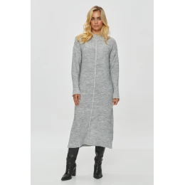 Tento dámský dlouhý svetr má jednoduchý, klasický střih, který sahá pod kolena, takže je ideální pro chladnější dny. Je vyroben ze silnější, tělové tkaniny s viditelnou strukturou úpletu. Vrchní část svetru má zaoblený výstřih a rukávy jsou dlouhé a zakončené širokým lemem, což dodává svetru větší eleganci a teplo. Vzor na svetru je minimalistický, bez dalších ozdob, s výjimkou jemné svislé linky procházející středem, která opticky prodlužuje siluetu. Tento svetr je ideální volbou pro zimní dny, neboť kombinuje pohodlí a styl. Lze jej nosit jak s vysokými botami, tak s ležérnější obuví, což z něj činí univerzální kousek šatníku.