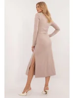 Elegantní, jednoduché šaty klasického střihu jsou ideální volbou pro slavnostní příležitosti a do práce. Jsou vyrobeny z vysoce kvalitního materiálu, který je kombinací viskózy a elastanu, poskytují pohodlí a mírně se přizpůsobí siluetě. Hladký vzor dodává šatům univerzální nádech, který se bude hodit k mnoha outfitům. Šaty sahají do poloviny lýtek a působí elegantně a profesionálně. Dlouhé rukávy a splývavý výstřih dodávají šatům jemnou ženskost a zároveň zajišťují pohodlí během nošení. Šaty nemají zapínání, což podtrhuje jejich minimalistický styl, zatímco pásek na zavázání v pase pomáhá zvýraznit siluetu. Tato elegantní a zároveň jednoduchá kreace se bude dobře hodit jak na formální vycházky, tak na každodenní profesionální styling do práce.