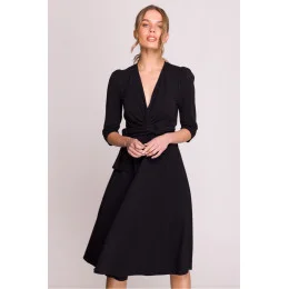 Elegantní a pohodlné šaty z modálního pletiva, které skvěle kombinují pohodlí s ženským stylem. Model s přiléhavým vrškem a výstřihem ve tvaru písmene V jemně zdůrazňuje postavu, a šněrování v pasu umožňuje perfektní přizpůsobení postavě. Lehce rozkročený spodek dodává šatům lehkost a volnost pohybu. Klasická délka po kolena a 3/4 rukávy ji činí univerzální volbou na různé příležitosti. Šaty se oblékají přes hlavu, bez zbytečných zapínání, co zajišťuje pohodlí nošení. Navrženo a ušito v Polsku, z nejkvalitnější modální pletiva měkké, prodyšné a příjemné k pokožce.