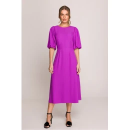 Romantické a ženské midi šaty s lehce rozklosovaným střihem, který krásně padá při pohybu. Klasický kulatý výstřih vpředu a subtilní výstřih ve tvaru písmene V vzadu dodávají šatům eleganci. Krátké nadýchané rukávy na podšívce dodávají šatům jemný, stylový charakter. Horní část je také podšita, co zajišťuje pohodlí nošení a ideální přizpůsobení. Model se zapíná na skrytý zip vzadu, díky čemuž celkový vzhled vypadá mimořádně esteticky. Šaty byly navrženy a ušity v Polsku s důrazem na každý detail. Ideální na speciální příležitosti, stejně jako na každodenní nošení v elegantním stylu.