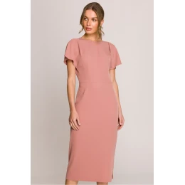 Elegantní a ženské midi šaty s přiléhavým střihem, který zdůrazňuje postavu. Zabudovaný vrch dodává klasický charakter, zatímco hluboký výstřih ve tvaru písmene V na zádech přidává jemnou smyslnost. Krátké rukávy zajistí pohodlí a všestrannost na různé příležitosti. Šaty se zapínají na skrytý zip na boku, díky čemuž se skvěle přizpůsobují tělu. Rozpark na boku dodává lehkost a volnost pohybu. Model navržen a ušit v Polsku s důrazem na detaily a vysokou kvalitu zpracování. Ideální na elegantní výstupy, večírky a speciální příležitosti.