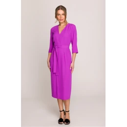 Elegantní a ženské midi šaty s přiléhavým střihem, které krásně zdůrazňují postavu. Vrchní část s výstřihem ve tvaru V, částečně podšitá, dodává subtilní lehkost, zatímco 3/4 rukávy dodávají klasický charakter. Spodní část s přesahujícím motivem zaručuje volnost pohybu a zjemňuje postavu. Na zádech v pasu je vsazena elastická guma, která se přizpůsobí postavě, a dodatečný vázaný pásek umožňuje zdůraznění pasu podle vlastních preferencí. Šaty se zapínají na skrytý zip po stranách, což zajišťuje estetické provedení. Model navržen a ušit v Polsku s důrazem na každý detail. Ideální na speciální příležitosti a elegantní výstupy.