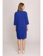 Volný a pohodlný šaty s volným střihem, sahající před koleno. Má rukávy dlouhé 3/4 a výstřih s jemným prořezem, zdobený elegantním knoflíkem. Na zádech se zapíná na skrytý zip a dole má jemné rozparky, které poskytují větší pohyblivost. Model bez podšívky, ideální na různé příležitosti. Šaty byly navrženy a ušity v Polsku z vysoce kvalitní látky, která zaručuje pohodlné nošení a stylový vzhled.