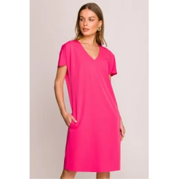 Šaty s volným střihem, který poskytuje volnost pohybu a pohodlí po celý den. Délka po kolena je univerzální volbou na mnoho příležitostí. Krátké rukávy dodávají lehkost, skvěle se hodí na teplejší dny. Výstřih ve tvaru písmene V jemně zdůrazňuje krk, dodávajíc šatům ženský charakter. Skrytý zip na zádech zajišťuje pohodlné oblékání a další rozpark na spodní straně zády dodává trochu elegantního akcentu. Šaty jsou bez podšívky, co je činí ještě vzdušnějšími a pohodlnějšími. Navrženo a ušito v Polsku, což zaručuje vysokou kvalitu provedení a péči o detaily. Skvělá volba pro ženy, které ocení styl, pohodlí a eleganci v každodenních outfitech.
