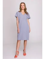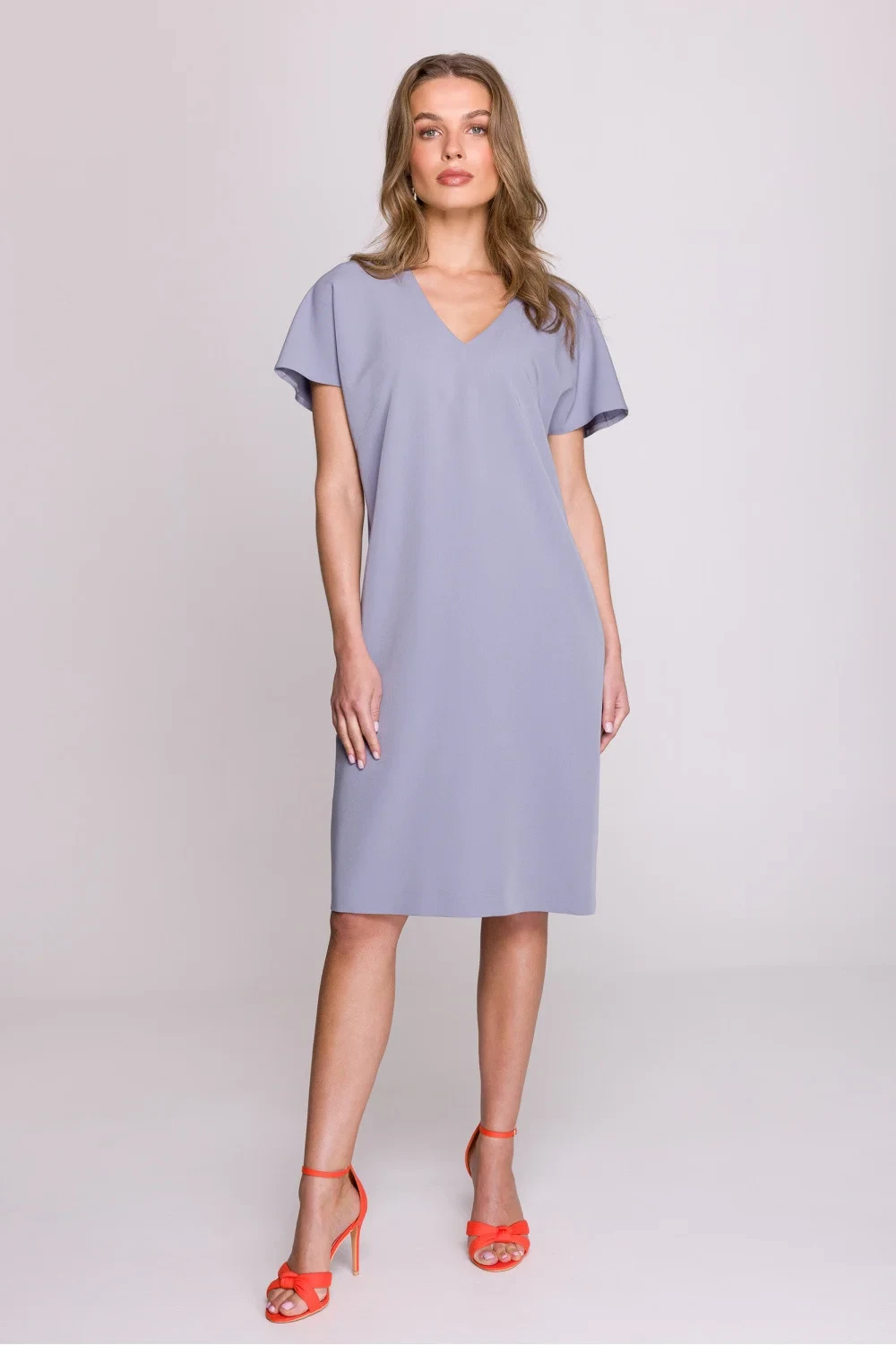 Šaty volného střihu, které poskytují volnost pohybu a pohodlí po celý den. Délka po kolena je univerzální volbou na mnoho příležitostí. Krátké rukávy dodávají lehkost, ideální pro teplejší dny. Vykrojení ve tvaru písmene V jemně zdůrazňuje krk, dodávajíc šatům ženský charakter. Skrytý zip vzadu zajišťuje pohodlí při oblékání a další rozpark vzadu přidává elegantní akcent. Šaty jsou bez podšívky, co je dělá ještě vzdušnější a pohodlnější. Navrženy a ušity v Polsku, co zaručuje vysokou kvalitu provedení a péči o detaily. Skvělá volba pro ženy, které ocení styl, pohodlí a eleganci v každodenních outfit.