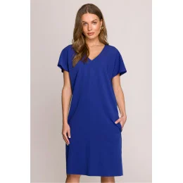 Šaty s volným střihem, který poskytuje volnost pohybu a pohodlí po celý den. Délka po kolena činí tyto šaty univerzální volbou pro mnoho příležitostí. Krátké rukávy dodávají lehkost a skvěle se hodí do teplejších dní. Výstřih ve tvaru písmene V jemně zdůrazňuje krk, dodávajíc šatům ženský charakter. Skrytý zip na zádech zajišťuje pohodlí při oblékání a dodatečný rozpark na spodní části zádů přidává šatičkám elegantní akcent. Šaty jsou bez podšívky, co je činí ještě prodyšnějšími a pohodlnějšími. Navrženy a ušity v Polsku, co zaručuje vysokou kvalitu zpracování a pečlivost o detaily. Skvělá volba pro ženy, které si cení styl, pohodlí a eleganci ve svých každodenních outfitcích.