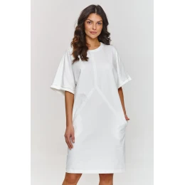 Šaty s krátkým rukávem jsou skvělou volbou pro ženy, které ocení jednoduchost a eleganci ve svých každodenních outfitcích. Jejich volný střih s lehkými detaily, jako jsou švy na přední straně, jí dodávají moderní a zároveň univerzální charakter. Široký rukáv sahající k lokti přináší volný, ležérní akcent a zároveň zůstává elegantní. Výstřih šatů má klasický, kulatý tvar, který decentně zdůrazňuje krk a zachovává jednoduchost outfitu. Kapsy na bocích jsou praktickým prvkem, který přidává funkcionalitu a zároveň zachovává minimalistický vzhled. Model má délku po kolena, což perfektně zdůrazňuje nohy a vytváří svěží, lehký vzhled. Šaty lze sladit s mnoha outfitovými styly a jsou skvělým pozadím pro módní doplňky. Můžete je zkombinovat s elegantními doplňky na večerní výstup nebo s ležérními na každý den. Díky jednoduchému, ale efektnímu střihu jsou ideální základ pro každý den, do práce, na setkání s přáteli nebo víkendový výlet. S jejich pomocí vytvoříte svěží, elegantní outfit, který snadno sladíte se svým stylem.