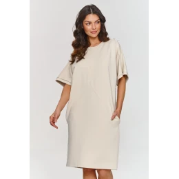 Šaty s krátkými rukávy jsou skvělou volbou pro ženy, které ocení jednoduchost a eleganci ve svých každodenních stylizacích. Jejich volný střih s lehkými detaily, jako jsou prošívání na přední straně, jí dodávají moderní a zároveň univerzální charakter. Široký rukáv sahající k lokti přináší volný, ležérní akcent a zároveň zůstává elegantní. Výstřih šatů má klasický, kulatý tvar, který jemně zdůrazňuje krk a zachovává jednoduchost kreace. Kapsy na bocích jsou praktickým prvkem, který přidává funkcionalitu a zároveň zachovává minimalistický vzhled. Model má délku před kolena, což dokonale zdůrazní nohy a vytvoří svěží, lehký vzhled. Šaty lze kombinovat s mnoha stylizacemi a jsou skvělým pozadím pro módní doplňky. Můžete je spojit s elegantními doplňky na večerní vycházku nebo s ležérními na běžné nošení. Díky jednoduchému, ale efektnímu střihu jsou ideální základ pro každodenní nošení, do práce, na setkání s přáteli nebo na víkendový výlet. S jejich pomocí vytvoříte svěží, elegantní stylizaci, kterou snadno sladíte se svým stylem.