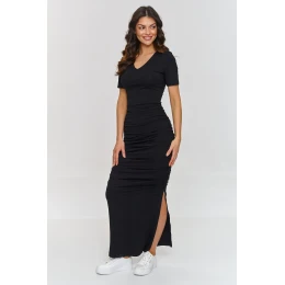 Sukně s mašlí je návrh, který spojuje eleganci a třídu. Vyrobená z měkké látky, dokonale padne do postavy, zdůrazňující její tvary. Mašle na bocích jí dodávají moderní charakter a jemně modelují postavu, zatímco výstřih ve tvaru písmene "V" zjemňuje krk. S rozparem na boku získává šaty lehkost a smyslnost, co z nich činí skvělou volbu na různé příležitosti. Maxi délka vytváří elegantní, prodlužující efekt postavy, který vám dodá sebejistotu. Model je vyroben z elastické látky, co zajišťuje pohodlí po celý den. Skvěle vypadá jak ve spojení s bílými teniskami na každý den, tak s elegantními botami na večerní výlety. Navíc díky své univerzální povaze bude skvělou volbou na každou roční dobu. Tato sukně s mašlemi a maxi délkou je návrh pro ženy, které si cení pohodlí, ale nechtějí se vzdát elegantního vzhledu. S její pomocí vytvoříte outfit na každou příležitost.