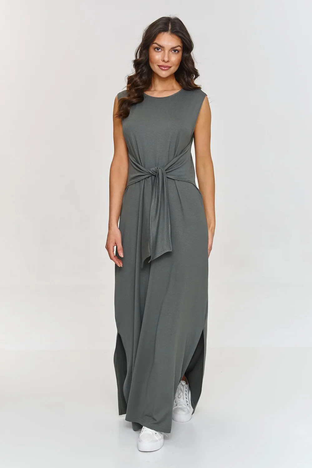 Elegantní maxi šaty vyrobené z lehké viskózové pleteniny jsou ideální volbou na jarní a letní dny. Vyznačují se volným střihem a pohodlným vázáním v pasu, které přidává ženskosti a umožňuje přizpůsobení šatů postavě, zajišťujíc zároveň pohodlí po celý den. Kulatý výstřih zajišťuje univerzálnost a absence rukávů z ní dělá skvělou volbu pro teplé dny. Maxi délka jí dodává eleganci a boční rozparky koketnosti a lehkosti, zároveň do outfitu vnášejí dynamický a moderní akcent. Šaty mají klasický a minimalistický střih, který se skvěle hodí jak do každodenních, tak do formálnějších kombinací. Jedná se o univerzální volbu, která pasuje k různým příležitostem. Kombinuj je se sportovními botami na běžné nošení nebo elegantními sandály, což z nich činí ideální volbu pro výlety do města, procházky nebo víkendový relax.