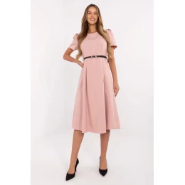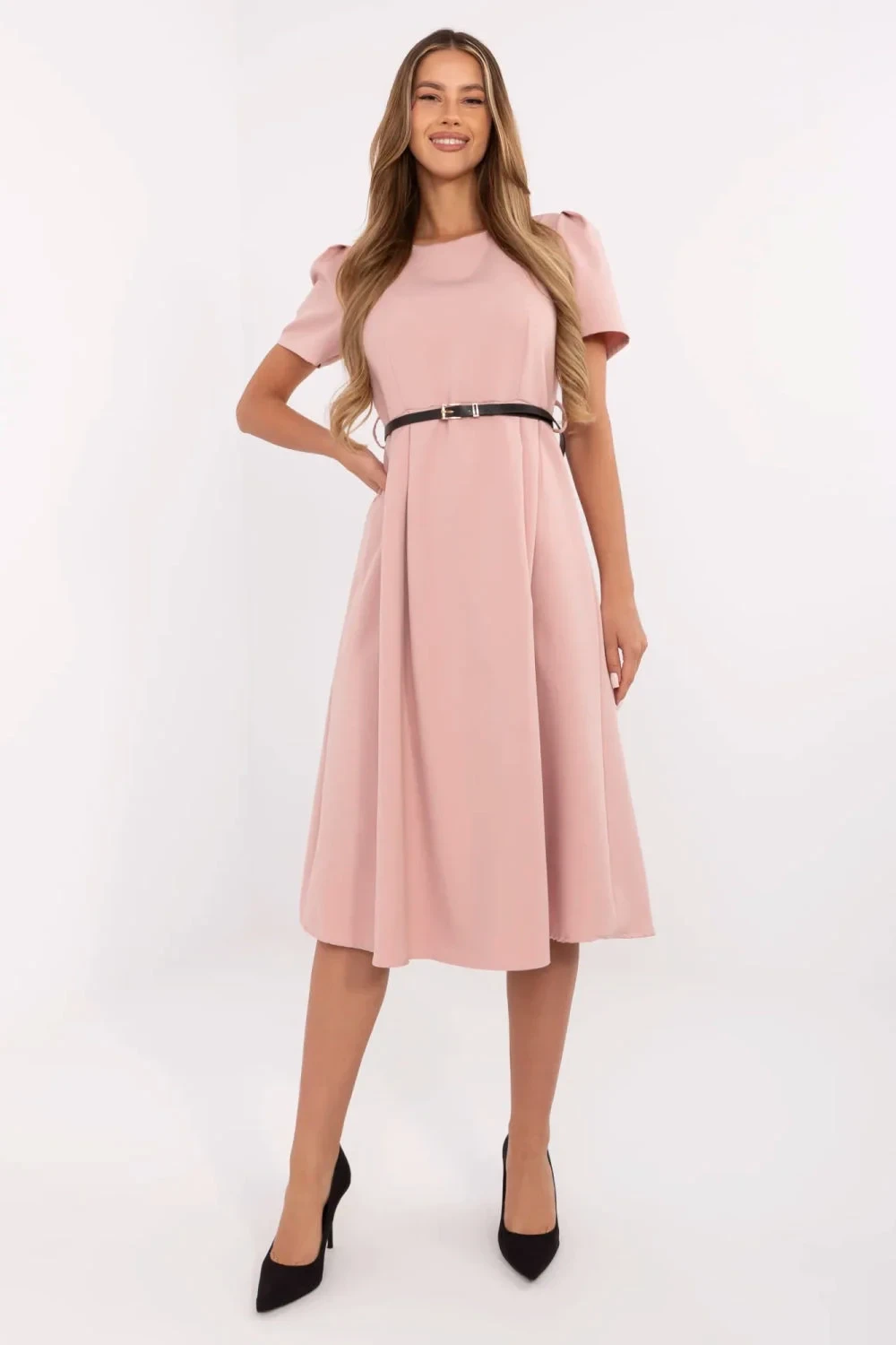 Klasické a ženské šaty s rozšířeným střihem jsou skvělou volbou pro ženy, které ocení eleganci a pohodlí. Vyrobené z měkkého, elastického materiálu (polyester s příměsí elastanu) se krásně přizpůsobují postavě a zajišťují volnost pohybu. Model midi délky s krátkým rukávem a kulatým výstřihem se hodí jak do práce, tak na společenské události. Jemné zvrásnění na ramenech a v pasu dodává celku něžný objem a zdůrazňuje pas, zatímco zapínací pásek ještě více zdůrazňuje ženskou siluetu. Hladký materiál v kombinaci s jednoduchou linií a zapínáním na zip na zádech vytváří nadčasový vzhled, který skvěle ladí s elegantními doplňky.