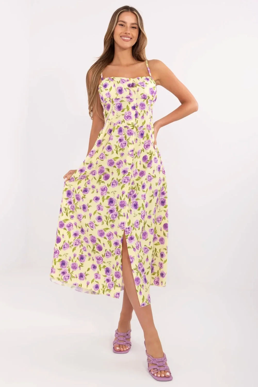 Elegantní a pohodlné šaty na každý den s ženským rozkrokovým střihem. Midi model s obdélníkovým výstřihem a vázáním ramínek, které umožňují perfektní přizpůsobení délky a zajišťují pohodlí při nošení. Korzetový pas krásně zdůrazňuje postavu, a vestavěné vycpávky poskytují dodatečnou podporu prsou, díky čemuž lze nosit šaty bez podprsenky. Na zádech jsou drapérie, které nejen dodávají šatům půvab, ale také zvyšují elasticitu a pohodlí nošení. Zapínání na knoflíky podél přední části dodává šatům dívčí charakter a usnadňuje oblékání. Módní květinový vzor dělá šaty nápadnými a zapadá do nejnovějších trendů. Vyrobeno z prodyšného materiálu, směsi polyesteru a elastanu, který zajišťuje volnost pohybu a perfektní přizpůsobení tělu. Skvělý návrh na každodenní vycházky, setkání s přáteli nebo volné letní procházky, vždy když chcete vypadat stylově, ale cítit se volně.
