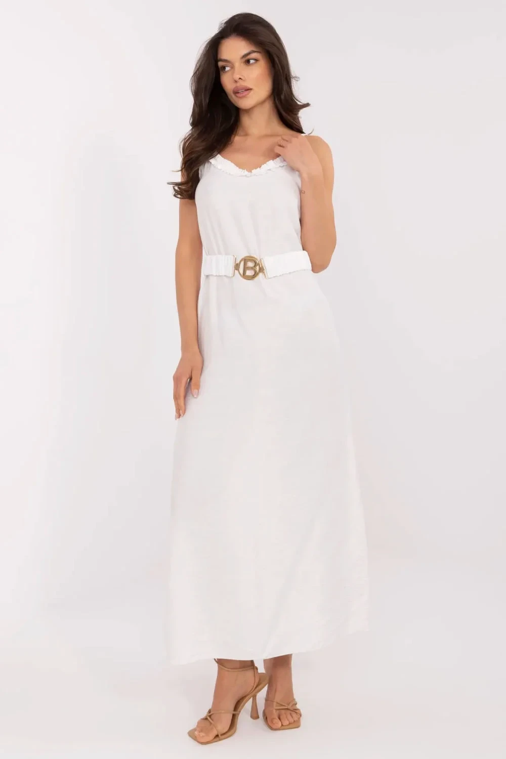 Tento stylový maxi šaty jsou ideální volbou na teplé letní dny. Vyrobené z prodyšné viskózy, poskytují pohodlí nošení a skvěle se hodí do každodenních outfitů. Jednoduchý střih v kombinaci s hladkým, jednobarevným materiálem jí dodává elegantní jednoduchost, která se hodí jak na procházku, tak na setkání s přáteli. Šaty mají výstřih do V, jemně zdobený ozdobným volánkem, co jim dodává ženské kouzlo. Na ramínkách, bez zapínání, snadno se oblékají a jsou velmi pohodlné. Přiložený pásek s přezkou umožňuje zdůraznit pas a dodat postavě požadovaný tvar. Jsou to ideální letní šaty lehké, stylové a univerzální, s jemnými detaily, které přitahují pozornost, aniž by přehlcely celkový vzhled.