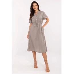 Elegantní a pohodlné letní šaty s rozkročeným střihem, ideální na každodenní příležitosti. Vyrobené z přírodní, prodyšné bavlny, poskytují pohodlí i v horkých dnech. Hladká látka zdůrazňuje lehký a univerzální charakter šatů. Model s krátkým rukávem a výstřihem do srdce decentně zdůrazňuje krk, a zapínání na knoflíky do pasu přidává celkovému vzhledu jemnou eleganci. Na hrudi jsou ozdobné kapsy s patkami, které šatě dodávají zajímavý, užitečný akcent. Pas je zdůrazněn šněrováním, což umožňuje přizpůsobit střih siluetě. Další výhodou jsou praktické, vsunuté boční kapsy. Midi šaty se skvěle hodí jak na procházku, nákupy, tak i na neformální setkání.