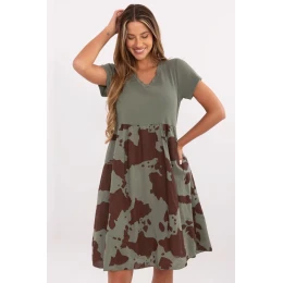 Tato letní, rozklosaná šaty jsou spojením pohodlí, stylu a originálního designu. Vyrobené z prodyšné směsi bavlny a elastanu, skvěle se hodí na každý den, jak ve městě, tak během letního odpočinku. Horní část šatů je ušita z pruhované látky, která jemně kopíruje siluetu, zdůrazňující její přednosti. Výstřih do šálku a krátké rukávy dodávají celku lehkost a ženské kouzlo. Spodní část šatů zdobí originální zvířecí motiv, který přidává charakter a prolomuje klasický, hladký vrch. Model po kolena je nejen stylový, ale i funkční, má praktické kapsy skryté v bocích švů, které zvyšují pohodlí nošení. Tyto šaty jsou ideální na každodenní výlety, spojují jednoduchost s trochou divokého akcentu, vytvářející výjimečnou nabídku pro ženy, které oceňují pohodlí a módní vzhled.