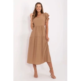 Elegantní a ženské letní šaty s rozkročeným střihem jsou skvělým návrhem na každodenní nošení i do práce. Vyrobené z lehké a prodyšné směsi viskózy a nylonu poskytují pohodlí i v nejteplejších dnech. Model midi délky krásně padne na siluetu a pásek umožňuje jemné zdůraznění pasu. Hladký materiál dodává šatům univerzální elegantní charakter, díky čemuž je snadno kombinovat s různými stylizacemi. Krátký rukáv ve formě volánků dodává lehkost a romantický půvab, zatímco výstřih do V opticky prodlužuje krk a dodává ženský šarm. Šaty se zapínají na knoflíky vzadu, což je stylový detail a usnadňuje oblékání. Ideální volba pro ženy, které si cení pohodlí, eleganci a funkčnost, jak při hektickém denním běhu, tak i během klidných letních dní.