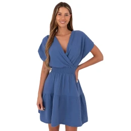 Lehké a vzdušné mušelínové šaty jsou ideální volbou na letní dny. Vyrobena z přírodní bavlny, ohromuje pohodlím nošení a jemností materiálu. Rozkročený střih se krásně skládá během pohybu, dodává siluetě lehkost a jemnou eleganci. Model po kolena má krátký rukáv a ženský přesýpací výstřih, který opticky prodlužuje krk a zdůrazňuje poprsí. Čalounění v pasu jemně zdůrazňuje pas, vytváří elegantní linii postavy a absence zapínání dělá z šatů snadno nasazitelný a mimořádně pohodlný pro každodenní nošení. Hladký vzor a klasický střih z ní dělají univerzální kus šatníku, ideální na procházku, nákupy nebo setkání s přáteli.