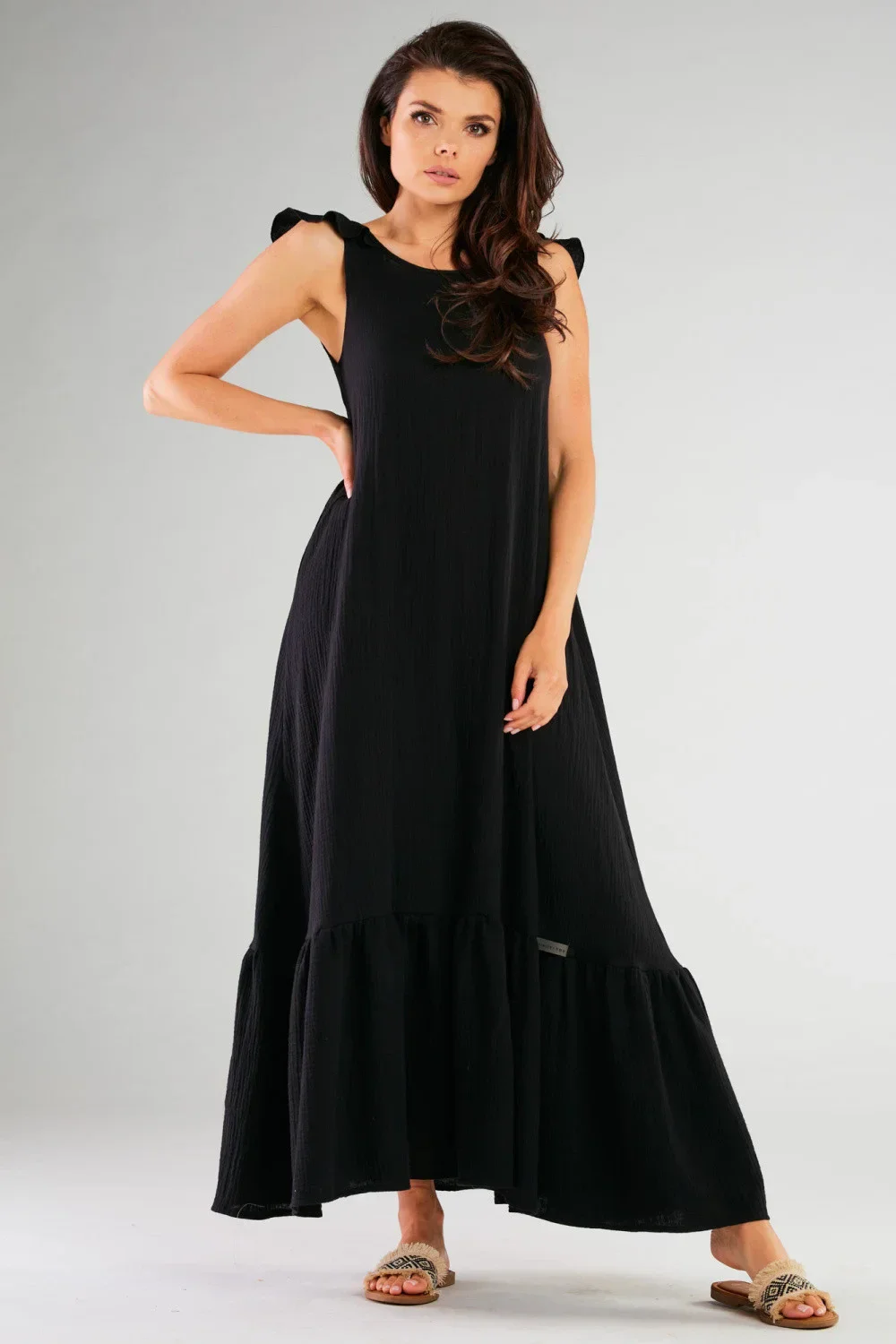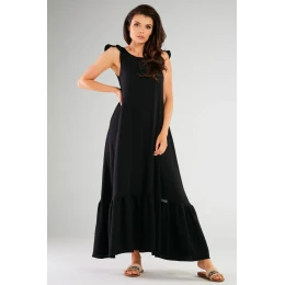 Dlouhé šaty vytvořené pro milovnice romantických a zároveň pohodlných stylizací. Vzor se rozšiřuje směrem dolů, skvěle zakrývá drobné nedokonalosti těla. Navrženo a ušito v Polsku.