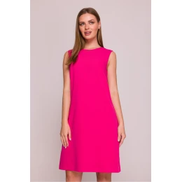 Elegantní šaty vyrobené z hladké, lehce elastické látky s lesklým saténovým povrchem, který jemně září a dodává celku jedinečný charakter. Model s kulatým výstřihem pod krkem zdobený kovovým detailom, který dodává subtilní eleganci. Šaty bez rukávů se zapínáním na skrytý zip na zádech, co zajišťuje pohodlné nošení a minimalistický vzhled. Střih je jednoduchý, trapezový, volný a neobepínající postavu, ideální na každý den a do kanceláře. Šaty mají podšívku, která zvyšuje pohodlí a trvanlivost oblečení. Délka před koleno zdůrazňuje ženskou siluetu a zároveň zajišťuje volnost pohybu. Navrženo a vyrobeno v Polsku.