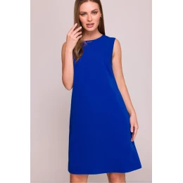 Elegantní šaty vyrobené z hladké, lehce elastické látky s saténovým povrchem, který jemně leskne a dodává celku jedinečný charakter. Model s kulatým výstřihem pod krkem zdobený kovovým prvkem, který přidává jemnou eleganci. Šaty bez rukávů, zapínající se na skrytý zip vzadu, což zajišťuje pohodlí nošení a minimalistický vzhled. Střih je jednoduchý, trapezový, volný a nevystihuje postavu, ideální na každý den a do kanceláře. Šaty mají podšívku, která zvyšuje pohodlí a odolnost oblečení. Délka před kolena zdůrazňuje ženskou siluetu a zároveň poskytuje volnost pohybů. Navrženo a ušito v Polsku.