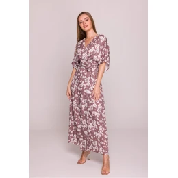 Tato lehká vzdušná šaty jsou vyrobeny z lehké, prodyšné viskózy zdobené jemným květinovým vzorem, který jí dodává romantický charakter. Volný střih s rozšířeným dnem a šněrováním v pasu umožňuje pohodlné přizpůsobení a zdůraznění siluety. Výstřih ve tvaru písmene V decentně zdůrazňuje krk a volné rukávy sahající ke lokti zajistí pohodlí a volnost pohybu. Šaty nemají podšívku ani kapsy, co zdůrazňuje jejich lehkost a přirozený styl. V přední části je efektní rozpark, který celku dodává eleganci a lehkost. Navrženo a ušito v Polsku, ideální na teplé dny, jak do každodenního nošení, tak na speciální příležitosti.