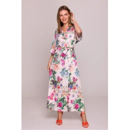 Tato lehká šaty jsou vyrobeny z lehké, prodyšné viskózy zdobené jemným květinovým vzorem, který dodává romantický charakter. Volný střih s rozšířeným dnem a vázáním v pase umožňuje pohodlné přizpůsobení a zdůraznění postavy. Výstřih ve tvaru písmene V decentně zdůrazňuje krk, a volné rukávy sahající po loket zajišťují pohodlí a volnost pohybu. Šaty nemají podšívku ani kapsy, co zdůrazňuje jejich lehkost a přirozený styl. V přední části je efektní rozparek, který dodává celku eleganci a lehkost. Navrženo a ušito v Polsku, ideální na teplé dny, jak do každodenního života, tak na speciální příležitosti.