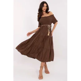 Letní midi šaty s rozkročeným střihem jsou skvělou volbou jak na každodenní nošení, tak na společenské události. Vyrobené z lehké a prodyšné směsi viskózy a nylonu, poskytují pohodlí v teplých dnech. Hladký materiál zdůrazňuje elegantní a zároveň decentní charakter šatů. Horní část je zdobená hispánským výstřihem se zástěrkami a elastickými gumičkami, krásně vystavuje ramena a dodává stylizaci ženskost. Krátké rukávy s volánky přidávají lehkost a romantické kouzlo. Model nemá zapínání, obléká se přes hlavu. V pasu je pásek k uvázání, který pomáhá zvýraznit siluetu a přizpůsobit šaty postavě. Ideální na procházky, letní večírky nebo setkání s blízkými.