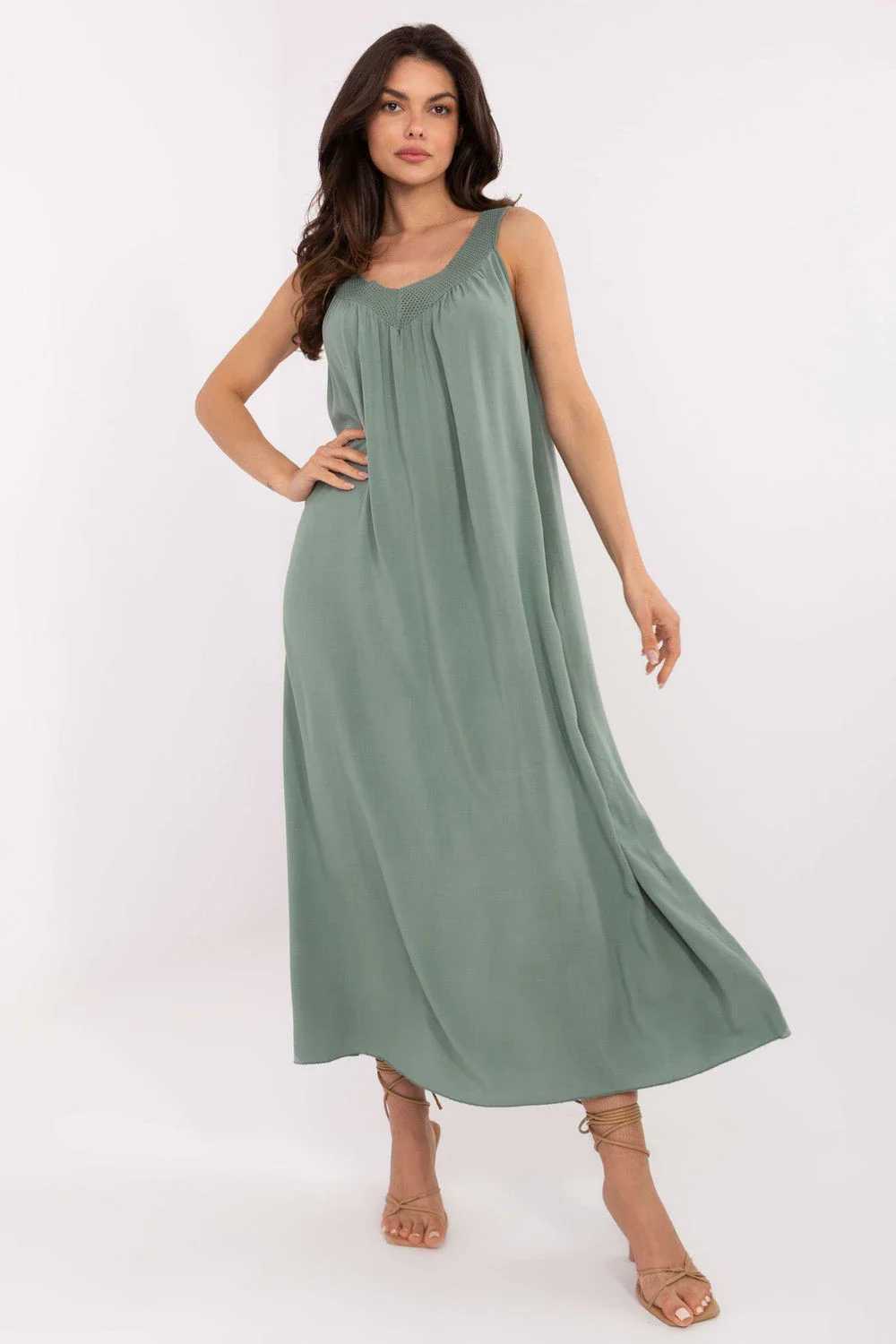 Letní midi šaty ve stylu oversized jsou ideální volbou pro každodenní volné stylizace. Vyrobena z lehké a prodyšné viskózy, skvěle se hodí na teplé dny, poskytující pohodlí a pohodlí. Hladká látka a volný střih zaručují plnou volnost pohybu, a výstřih do V decentně zdůrazňuje linii krku a přidává ženský půvab. Šaty na tenkých ramínkách, bez zapínání, snadné oblékání a mimořádně praktické. Je to ideální model na léto lehký, prodyšný a stylový ve své jednoduchosti.