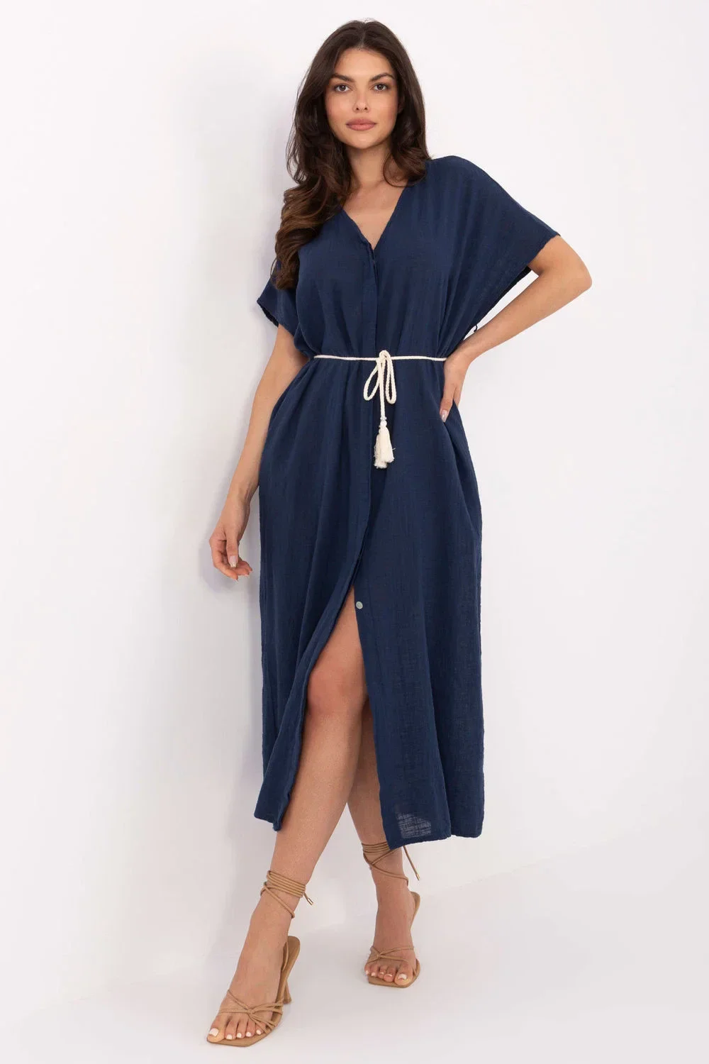 Letní košilové šaty v boho stylu jsou pohodlným a stylovým návrhem na každý den. Vyrobené z přírodní, prodyšné bavlny, zajistí pohodlí i v nejteplejších dnech. Oversize střih zaručuje volnost pohybu a volné, nezávazné přizpůsobení, hladká látka dodává šatům univerzální charakter. Model midi délky s krátkým rukávem a výstřihem do V vypadá lehce a žensky. Zapínání na knoflíky skryté pod lištou dodává celku elegantní dokončení. Další výhodou jsou kapsy na straně a pásek k zavázání s ozdobnými řasami, který umožňuje zdůraznit pas a přidat outfitu boho stylu. Ideální na letní dny, pohodlné, stylové a praktické.
