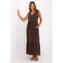 Dlouhé letní šaty s rozkročeným střihem jsou ideální volbou pro každodenní teplé dny. Vyrobené z přírodní bavlny poskytují prodyšnost a pohodlí i v největším horku. Model se širokými ramínky a dekoltem ve tvaru srdce jemně zdůrazňuje horní část postavy, zatímco volně padající spod s flitrem přidává lehkost a ženský šarm. Šaty nemají zapínání, což usnadňuje jejich oblékání a zaručuje pohodlí po celý den. Hladký vzor je univerzální a snadno se stylizuje, a praktické kapsy ve švech boků přidávají funkčnost. Jsou to must-have v letním šatníku, ideální na procházky, nákupy nebo setkání venku.