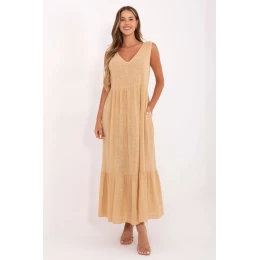 Dlouhé letní šaty s rozkročeným střihem jsou ideální volbou pro každodenní teplé dny. Vyrobené z přírodní bavlny, zajistí prodyšnost a pohodlí i v největším horku. Model s širokými ramínky a výstřihem do šípku jemně zdůrazňuje horní část postavy, zatímco volně padající spodní část zakončená volánem dodává lehkost a ženský šarm. Šaty nemají zapínání, což usnadňuje jejich oblékání a zaručuje pohodlí po celý den. Hladký vzor je univerzální a snadno se stylizuje, a praktické kapsy ve švech na bocích dodávají funkčnost. Jsou must-have v letní šatníku, ideální na procházky, nákupy nebo setkání venku.