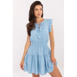 Lehké a ženské mini šaty vytvořené s ohledem na letní dny. Vyrobené z prodyšné směsi viskózy a nylonu, poskytují pohodlí i v horkých dnech. Hladký materiál podtrhuje jemný, romantický styl a rozkročený střih se krásně usazuje při pohybu. Šaty mají krátký rukáv ve formě volánku, který jim dodává dívčí kouzlo. Výstřih zdobený volánky a vázáním umožňuje jemné nastavení, zdůrazňující krk a ramena. V pasu jsou zalisované s elastickými gumičkami, které krásně modelují siluetu a zajišťují pohodlné přizpůsobení. Celkový dojem dotváří volánka na spodku, dodávající lehkost a volnost. Ideální volba na každodenní vycházky, procházky, setkání s přáteli nebo dovolené. Stylový a pohodlný must-have v každé letní garderobě!