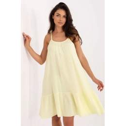 Lehké, prodyšné a neuvěřitelně pohodlné šaty vyrobené z jemné mušelínové bavlny jsou ideální na teplé letní dny. Hladký materiál a rozšířený střih vytvářejí stylový, ale zároveň volný návrh na každý den. Model po kolena s kulatým výstřihem a vázanými ramínky, které umožňují regulaci a přizpůsobení postavě. Spodní část šatů je zakončena efektní volánkou, která dodává celku lehkost a dívčí kouzlo. Jedná se o skvělou volbu na každodenní vycházky, procházky, dovolenou nebo setkání s přáteli. Přírodní látka a volný střih zajistí úplný komfort i při největším horku. Délka šatů je uvedena bez ramínek.