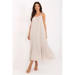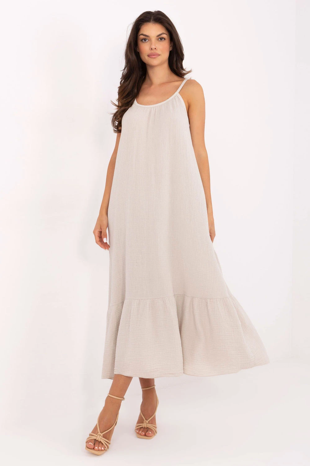 Lehké, vzdušné a neuvěřitelně pohodlné šaty vyrobené z jemné bavlněné mušelínu ideální na teplé letní dny. Hladký materiál a rozšířený střih vytvářejí stylový, ale zároveň volný návrh na každý den. Model střední délky s kulatým výstřihem a vázanými ramínky, které umožňují regulaci a přizpůsobení postavě. Spod šatů je zdoben efektní volán, který celku dodává lehkost a dívčí půvab. Jedná se o skvělou volbu na každodenní vycházky, procházky, dovolenou či setkání s přáteli. Přírodní tkanina a volný střih zajistí maximální pohodlí i v největším horku. Délka šatů je uvedena bez ramínek.